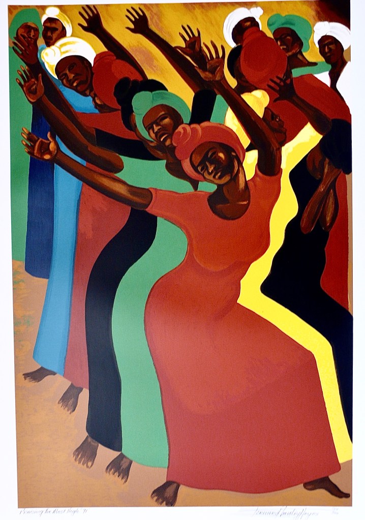 Praising the Most High, Limited Edition Serigraph 300 edition on stratamore paper 30×40” image size 23×34” Published by Caribbean Fine Arts, 1994